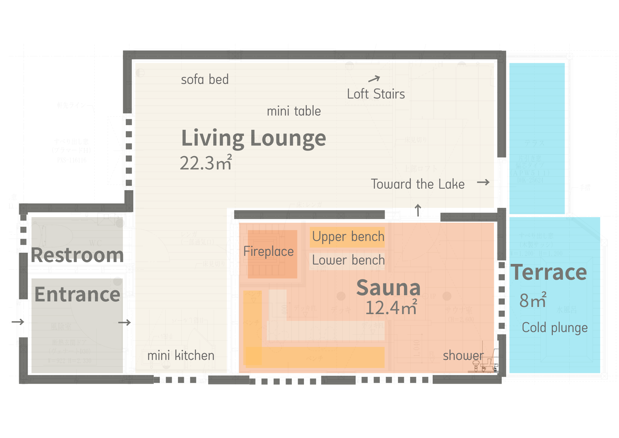 A shower space is located inside the sauna area.